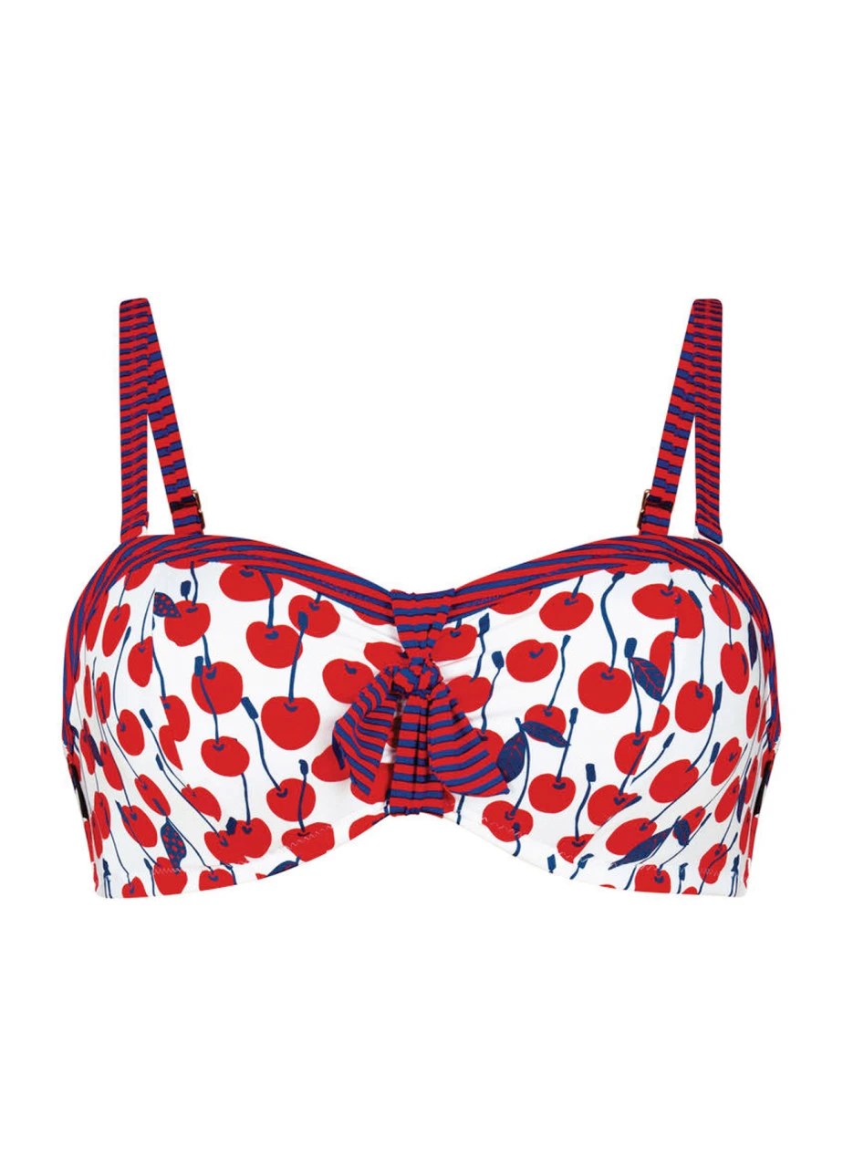 Sommerlaune pur! Das Bandeau Bikini-Top „Cherry Love“ bezaubert mit seinem erfrischenden Kirschenprint. Die verstellbaren Träger können einfach ausgehängt werden. Der im Bundfutter eingearbeitete Bügel formt und sorgt für guten Halt ohne einzuengen.