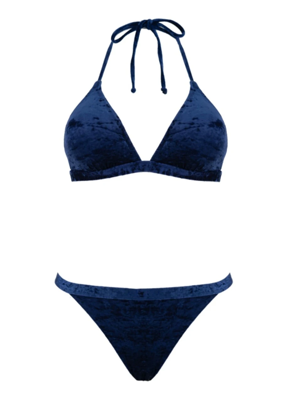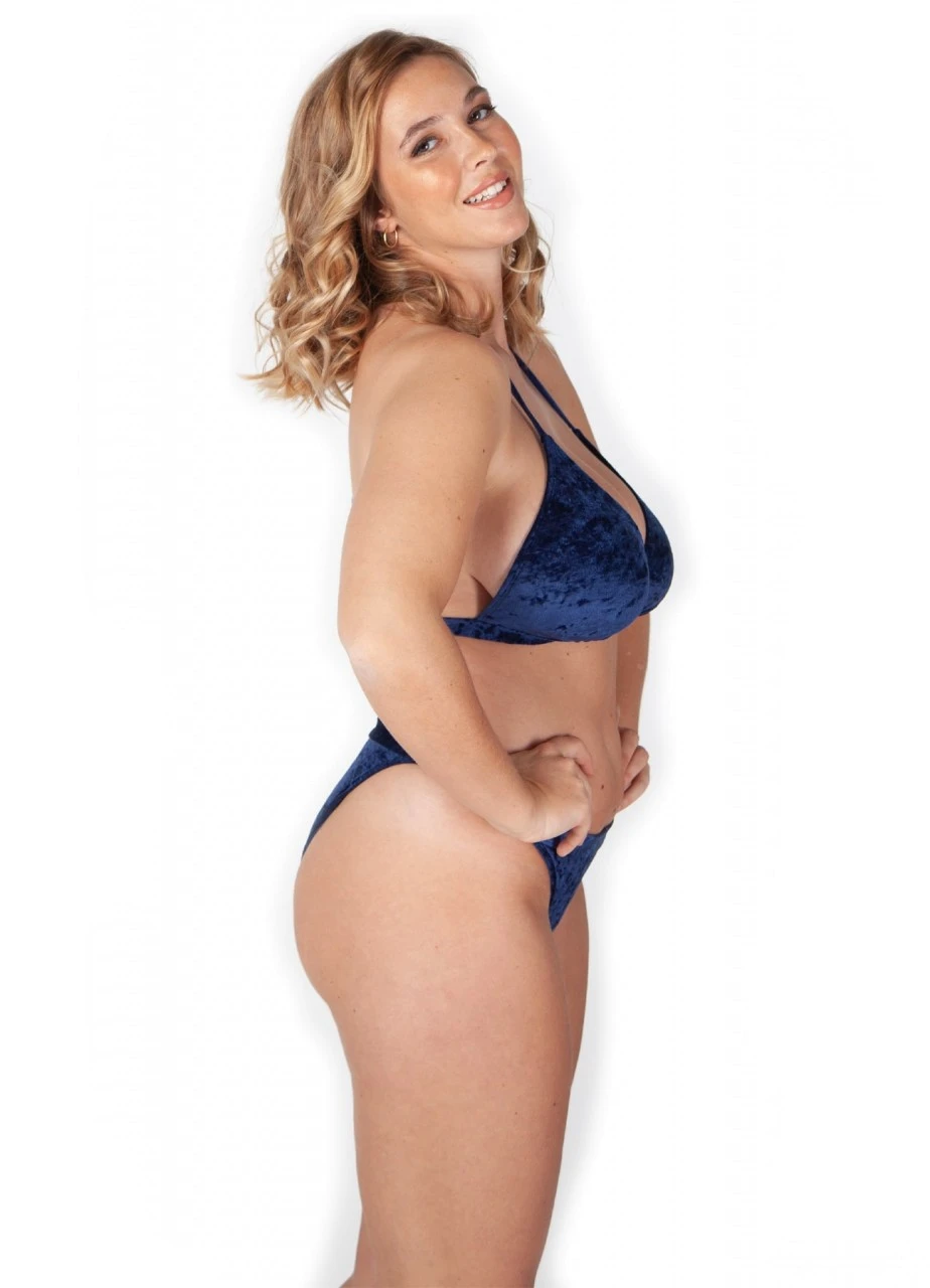 Das Bikini-Set „Velvet“ im angesagten Farbton Midnight Blue besticht ganz klar durch sein außergewöhnliches Material. Denn im Gegensatz zu herkömmlicher Bademode ist dieser Triangel-Bikini aus einem schimmernden Samtstoff, womit Sie am Strand ganz besonders hervorstechen. Ihre Brust wird hier noch mit einem Padding unterstützt, das Sie aber auch herausnehmen können. Im Nacken schließen Sie diesen Bikini mit einer Schleife, am Rücken durch einen Verschluss. Der Bikini Slip besitzt einen erhöhten Beinausschnitt und sorgt für einen wunderschönen Po. 26567M