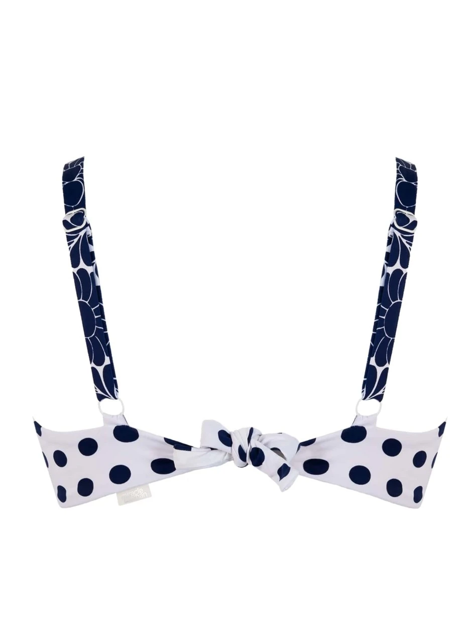 Gischtweiß und Meerblau: Diese zwei Farben ergeben eine tolle Ergänzung für diesen entzückenden Bikini im Tupfen- und Blumenprint. Eine kleine rote Ziernaht trennt den Stoffmix. Zum Binden am Rücken. 2555WB