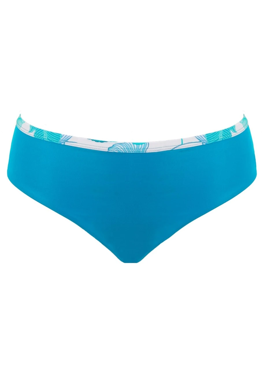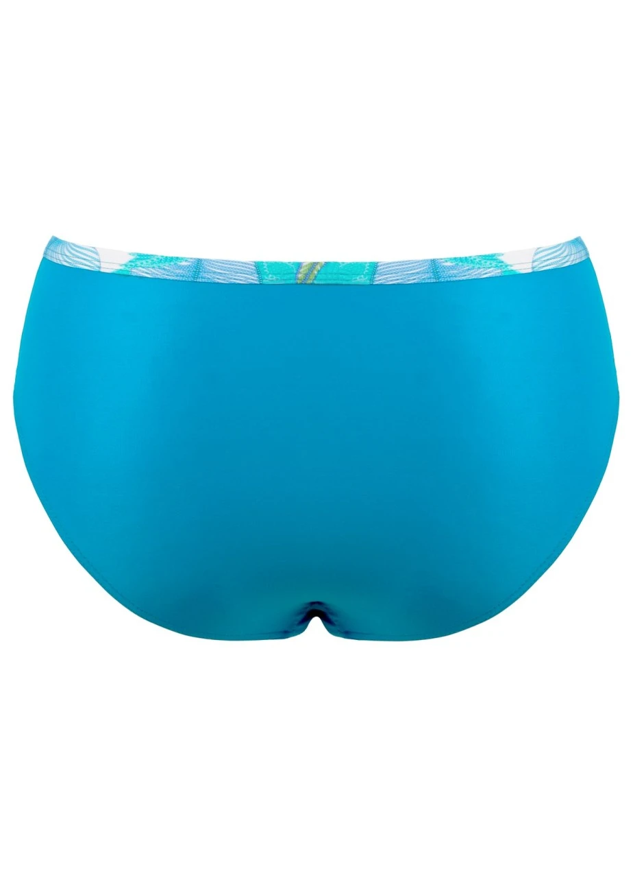 Der Bikinislip „Swim Leaves“ zeichnet sich besonders durch sein Print-Bündchen aus. Dieses ist – passend zu seinem Oberteil – im Trendthema „Tropic“ gehalten.