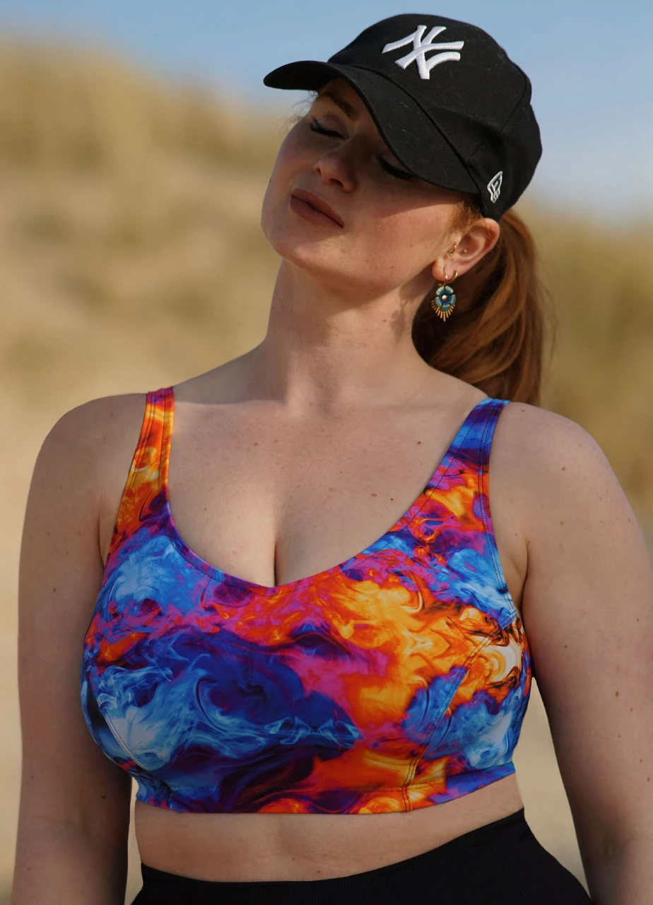 In leuchtenden Farben kommt der Bikini „Holi Festival“. Sein Stoff ist angenehm weich und sehr dünn, sodass er in der Sonne schnell trocknet. Dieses Top ist mit einem Powermesh unterfüttert, das für extra viel Halt sorgt. Auch das breite Unterbrustband bietet Support, weswegen Sie dieses Top auch zum Sport tragen können. Der Rückenteil ist in schwarz gehalten, so können Sie selbst bestimmen, wie bunt Ihre Tragevariante sein soll, denn sein passendes Höschen können Sie wenden – von bunt auf schwarz.