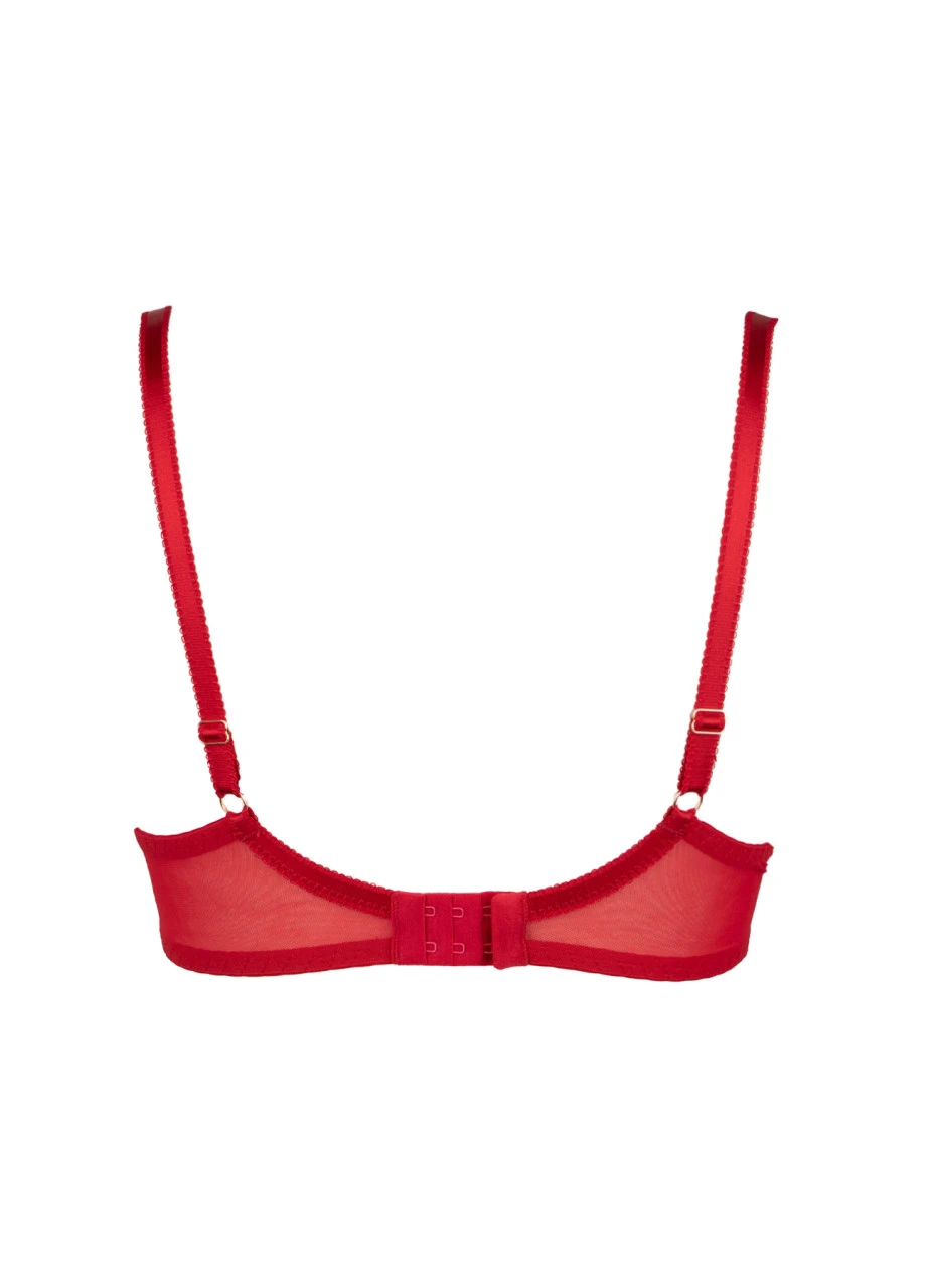 - Dekorative Metallschnallen mit roten Schmucksteinen (Zirkone) in der Brustmitte und an den Trägeransätzen
