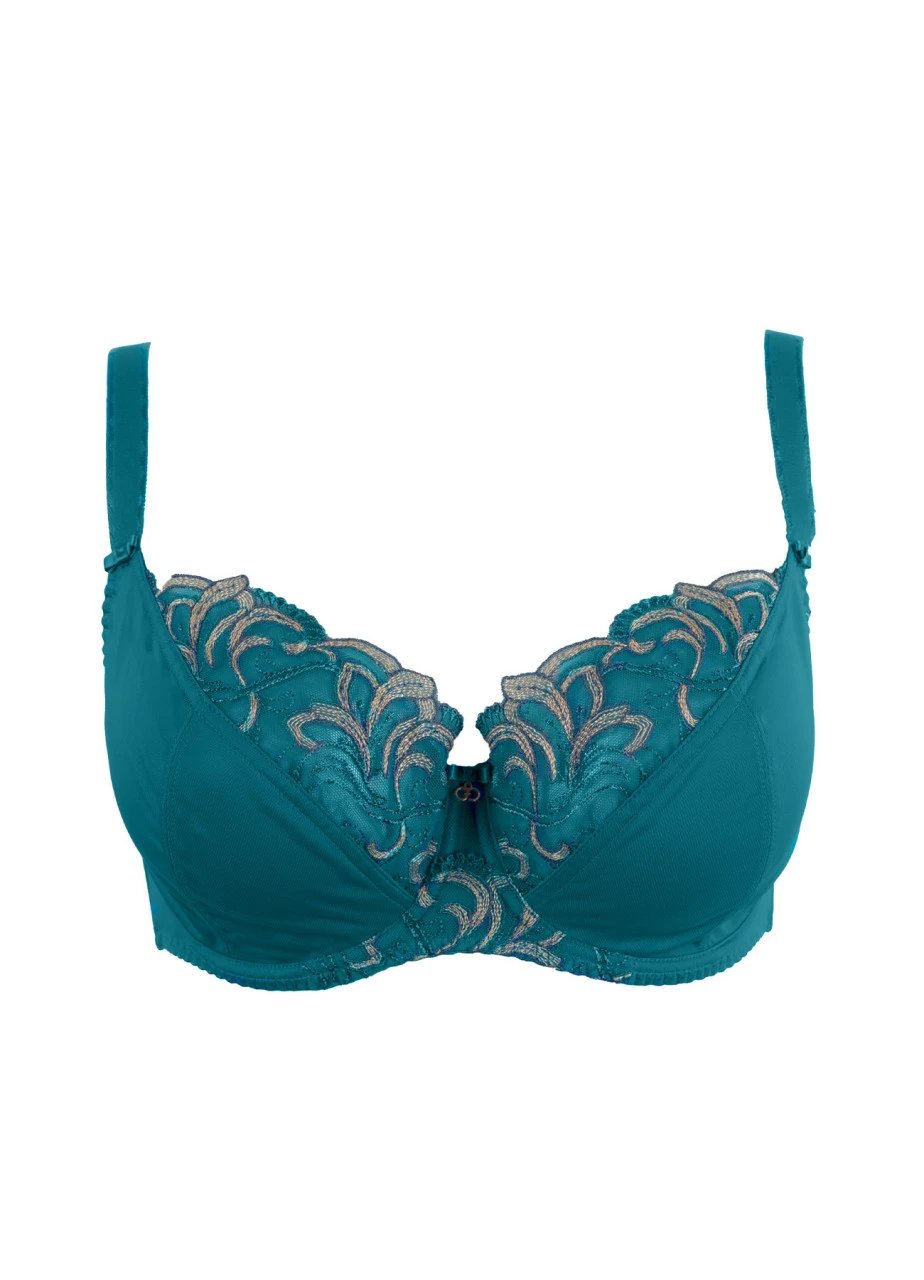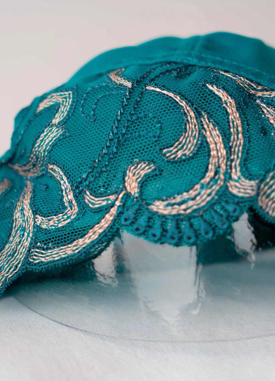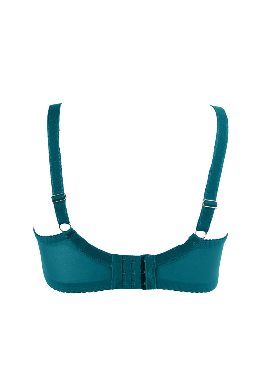„Molly“ ist ein wunderschöner BH in einem bezaubernden Azur-Ton mit feiner Stickerei in Beige, dunklem Azur und dezenten Glanzfäden. Die Stickerei ist unterfüttert, damit nichts an Ihrer Haut kratzt. Die farblichen Akzente und die kleinen Schleifchen in der Mitte und an den Trägern verleihen diesem Modell besonderen Charme. Die vollen unelastischen Cups geben perfekten Halt und sorgen mit ihrer edlen Verarbeitung für ein attraktives Dekolleté. Für extra Stabilität sorgen Stäbchen im Seitenteil. Der Rückenteil besteht aus attraktivem Powermesh.