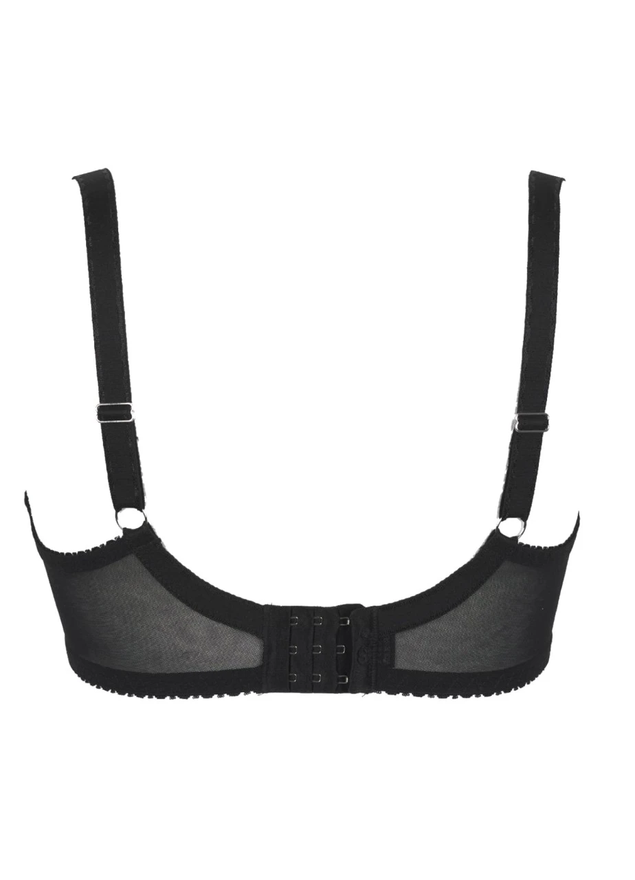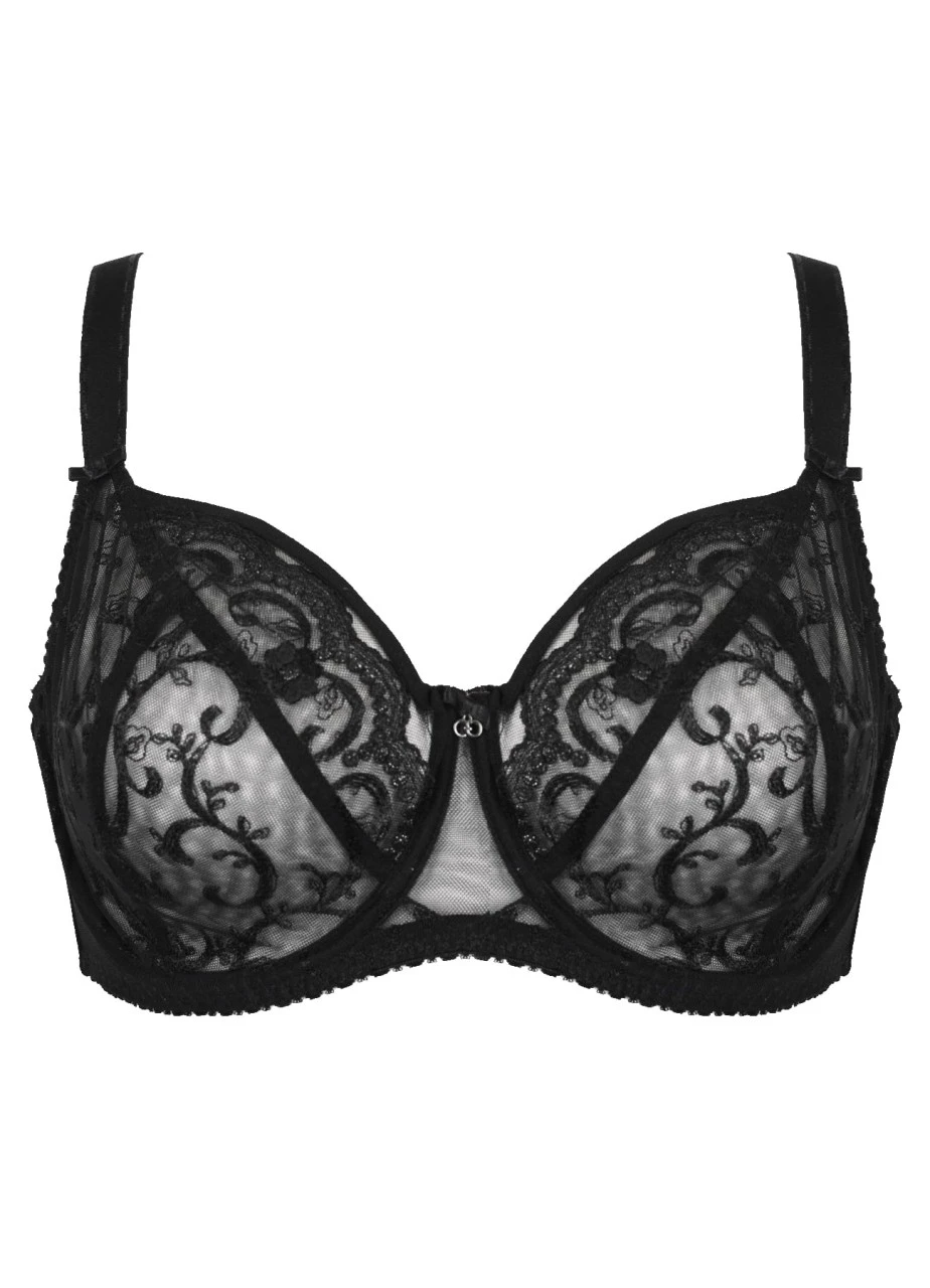 Der verführerische Bügel-BH „Roma“ in Schwarz mit verspielter Blumenranken-Stickerei hat im Obercup an der Bogenkante noch zusätzlich einen Lamé-Faden eingestickt. Der Cup ist mit unelastischem Tüll gefüttert, damit eine transparente Optik entsteht. Stäbchen im Seitenteil unterstützen beim Tragen den Rücken. Besonders stabile Bügel, Metallringe und Schieber zum verstellen des Trägers sorgen für den perfekten Halt. Kleine Maschen an den Trägern vorne und am Mittelstück perfektionieren den Büstenformer. Marke: Gorsenia