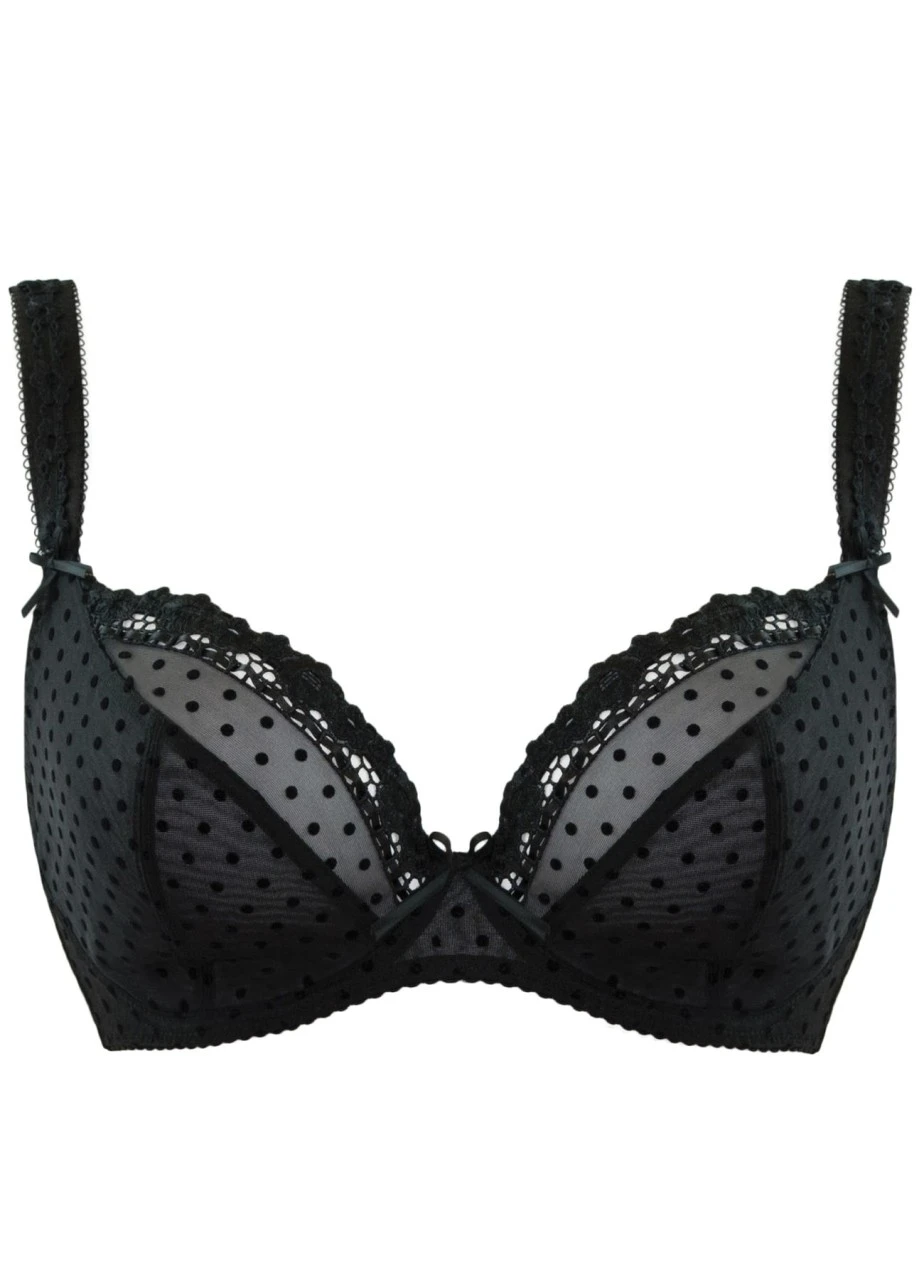 Der schwarze Bügel-BH „Princess Plunge“ mit Beflockung im Tupfenmuster sorgt für optimalen Halt. Die verspielte Spitze am Cup-Rand und das Schleifchen am verzierten Trägeransatz geben dem klassischen „Schwarzen“ einen verführerischen Look. Hinten mit 3-Haken Verschluss, verstellbare elastische Träger. Tipp: Die Cups sind etwas kleiner als Sie es von anderen BH’s gewohnt sind. Wenn Sie zwischen zwei Cup-Größen stehen, wählen Sie bitte stets die größere.