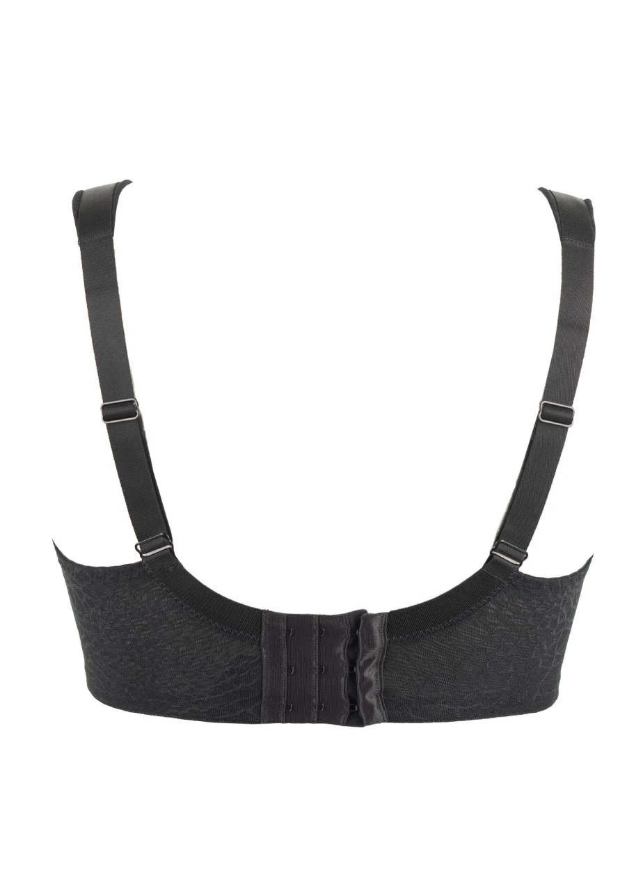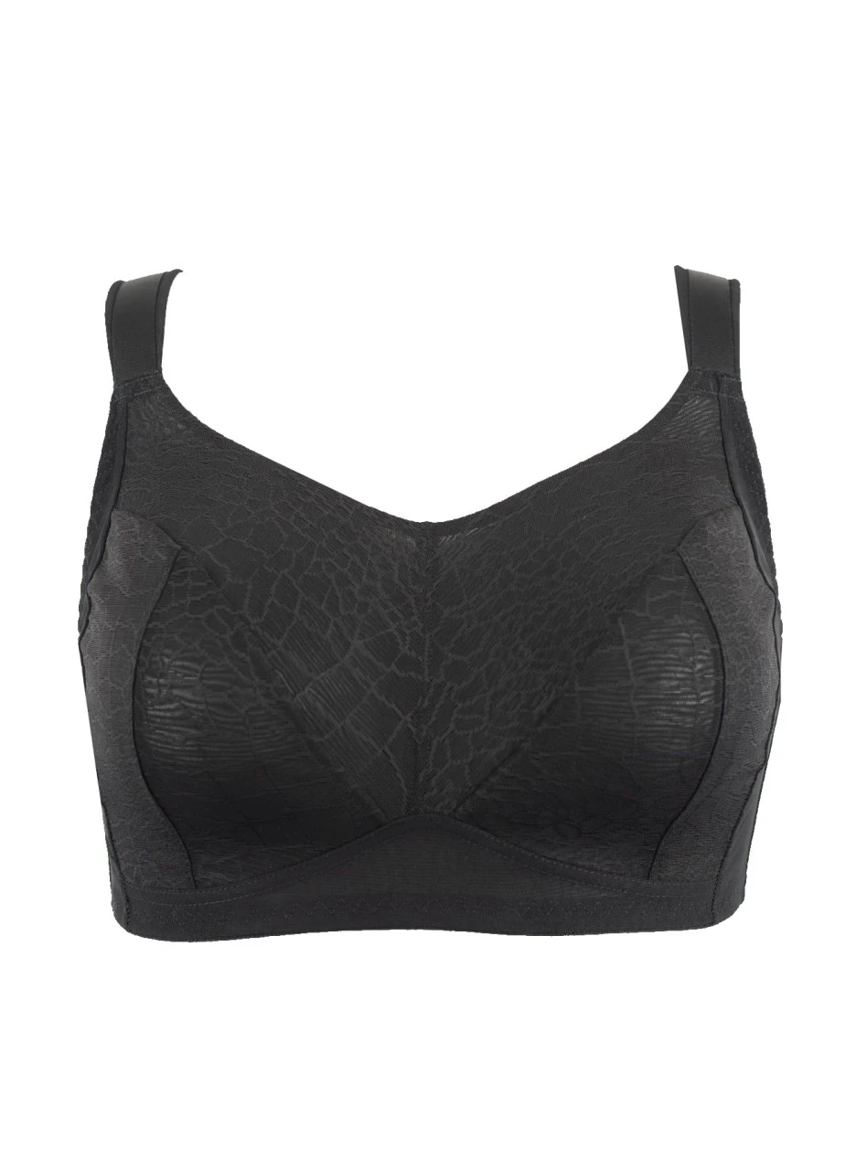 Der Komfort-BH „Fabiola“ in Schwarz hat keine Bügel und garantiert besten Halt mittels dopplellagiger Verarbeitung mit Powermeshfütterung. Grafisches, modernes Jaquardmesh ist in diesem BH eingearbeitet.