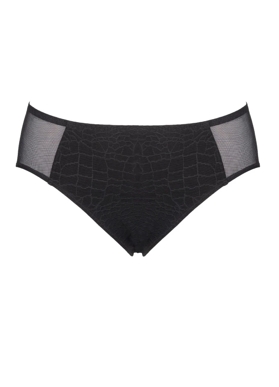 Der Minislip „Fabiola“ in klassischem Schwarz hat eine normale Slipform und ist komfortabel und verführerisch zugleich. Die Po- und Seitenteile sind transparent, die Vorderseite ist komplett mit Baumwolle unterlegt und undurchsichtig. Graphisches, modernes Jaquardmesh ist in diesem Slip eingearbeitet.