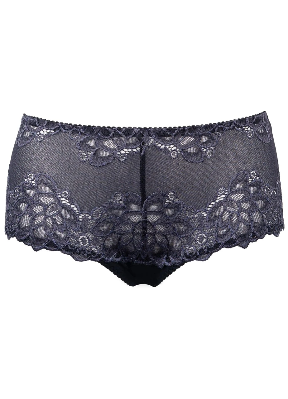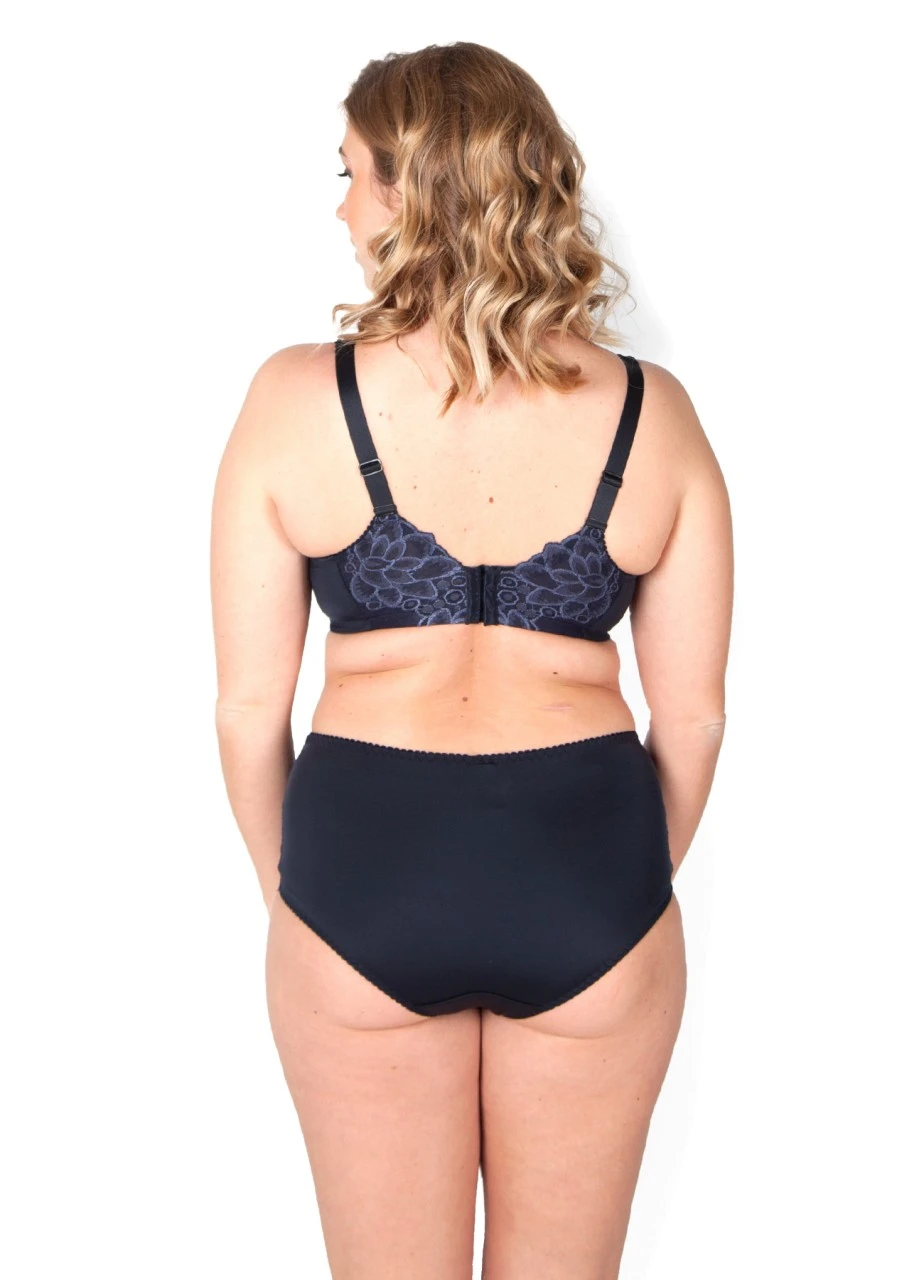 Die Panty „Carla“ schimmert in einem bezaubernden Nachtblau. Der Teil um den Po ist undurchsichtig und aus einem weichen, elastischen Material, das Sie kaum spüren. Der vordere Teil ist durch seine florale Spitze leicht durchsichtig.