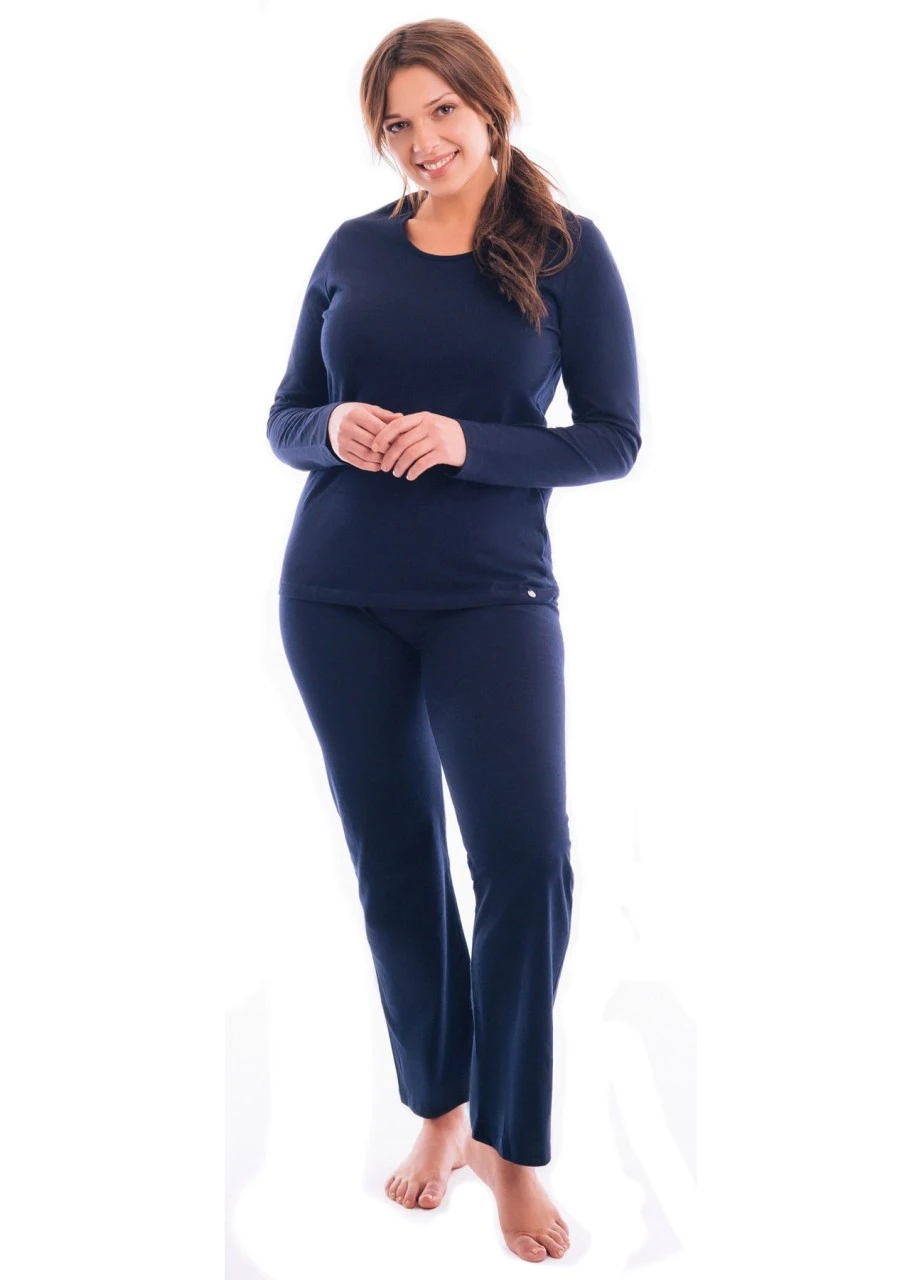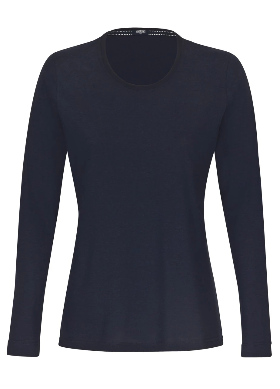 Das langärmige Shirt mit Rundhals-Ausschnitt in Marineblau besteht aus 100% Baumwolle. Das Shirt eignet sich perfekt als Kombination zu unseren Hosenmodellen.
