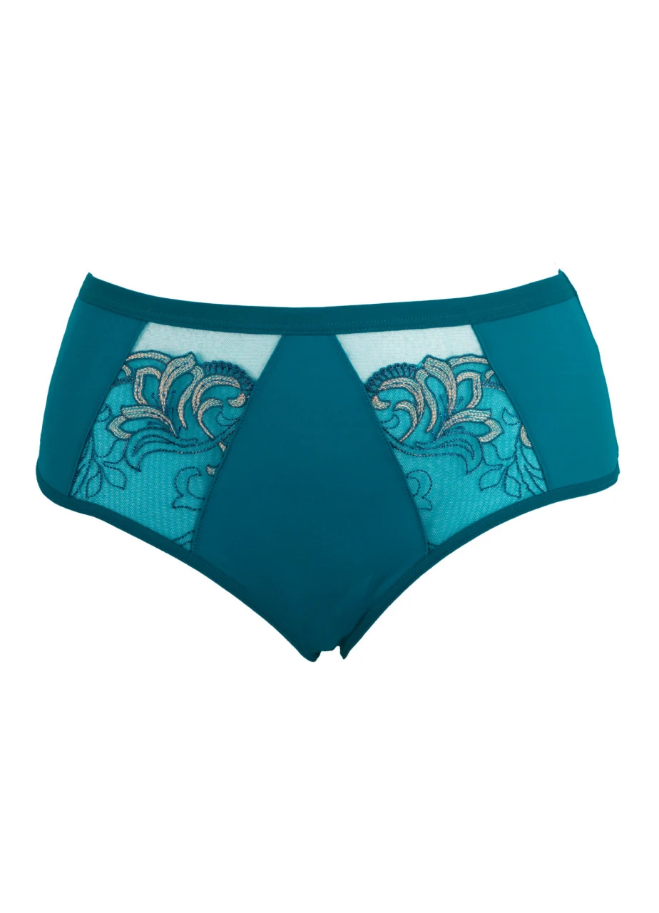 „Molly“ ist ein komfortabler Slip mit höherem Bund in frischem Azurblau – ein klassisches Model perfekt für jeden Tag. Die Stickerei und die floralen Akzente sorgen für besonderen Charme. Bestes Tragegefühl bieten der besonders flache Bund- und Beinabschluss und die verarbeitete weiche Mikrofaser. Im Poteil sorgt ein transparenter Einsatz für einen attraktiven Hingucker.