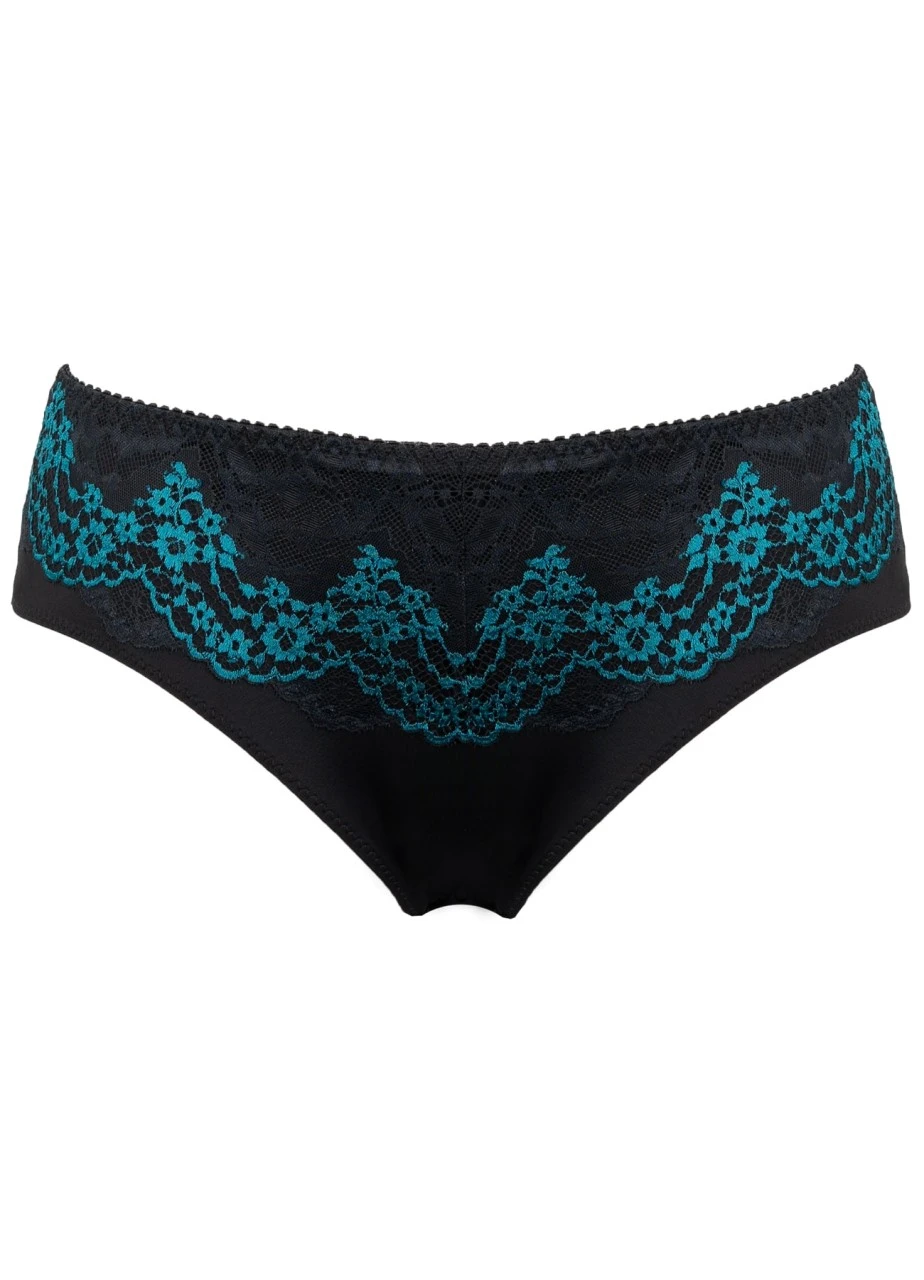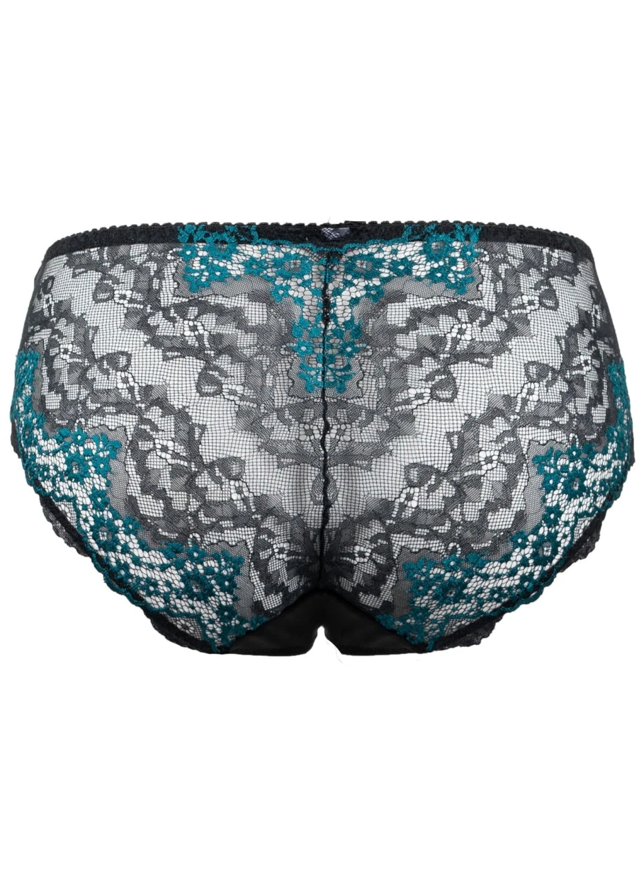 Der schwarze Slip „Natalie“ setzt den Po gekonnt in Szene. Zarte Spitze mit smaragdfarbenen Akzenten machen ihn zu einem verführerischen Teil, dass in Ihrer Garderobe nicht fehlen sollte.