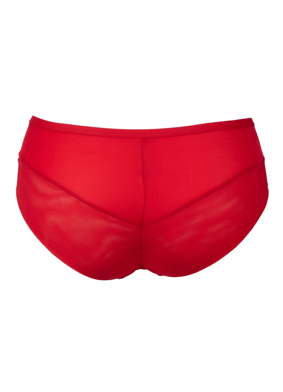 Die Vorderseite ziert ein zarter Spitzeneinsatz, der mit beigem Mesh gefüttert ist. Der Rückenteil besteht aus doppeltem Tüll. Besonderer Eyecatcher ist die dekorative Schnalle mit roten Schmucksteinen (Zirkone) und das freche Cut-Out in der vorderen Mitte.