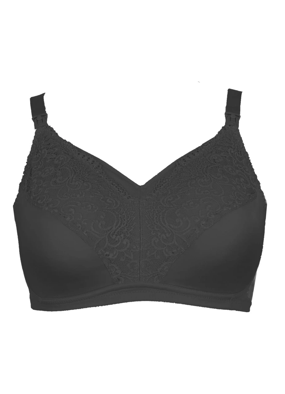 Der bügellose Still-BH „Mia“ in Schwarz sorgt für ein sehr angenehmes Tragegefühl durch sein innenliegendes Baumwollmaterial. Er ist optisch ein Hingucker durch die eingearbeitete zarte florale Spitze im Ausschnitt. Praktische Clips am Trägeransatz machen das Stillen besonders einfach.